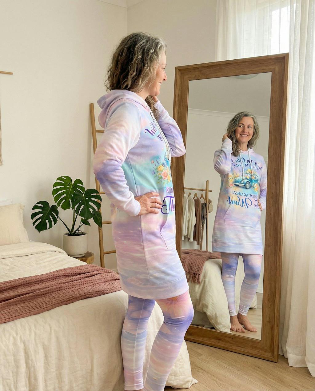 I'm 5'6", usually between a L and XL depending on the brand, and ordered the XL in the DRIFT. Perfect choice. It hits at my thigh—long enough for great coverage but not so long I'm tripping over it. The sleeves are long enough (which rarely happens!), and the hood actually fits over my thick hair without feeling tight.The fabric is what sold me though. It's this incredible soft fleece that feels substantial—not thin or cheap. The sage and cream tie-dye is even prettier in person than the photos. After three washes it still looks brand new. Colors haven't faded at all.I've worn it to morning yoga, to grab coffee, and honestly just living in it on weekends. Got two compliments at the farmers market. The pockets are deep enough for my phone and keys, which sounds small but makes such a difference.At 52, I've given up on trying to look 25 again. This dress lets me be exactly who I am—comfortable, creative, and unapologetically myself. Worth every penny.