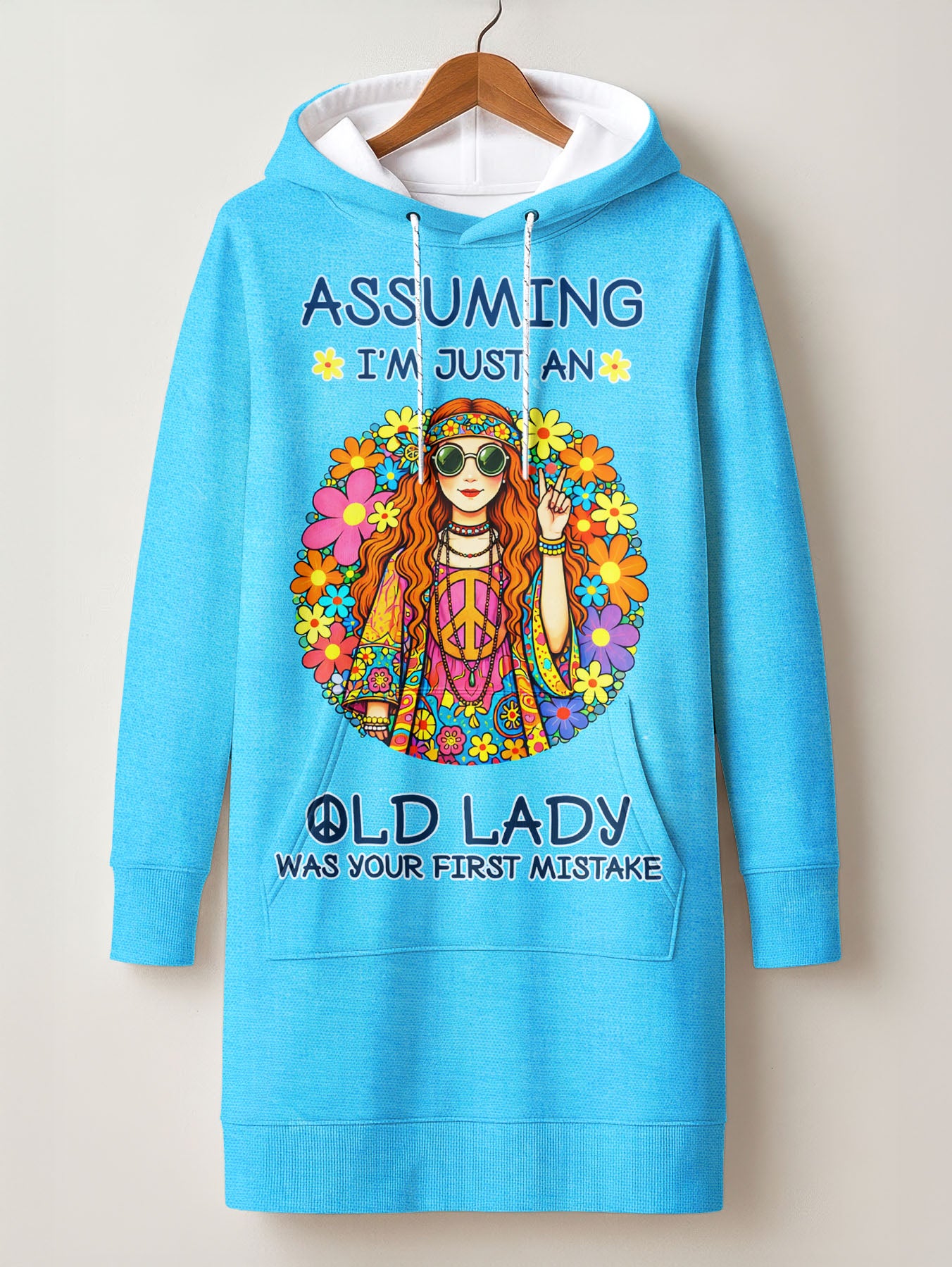 This is more than a hoodie dress it's a sky blue warning shot. Designed for women who've been underestimated one too many times, MOXIE wraps you in bold, hippie queen energy against a color as bright as your attitude. The flower child you were at 20 is still here still throwing peace signs, still unbothered, still proving them all wrong. Because assuming you're "just an old lady" was their first mistake. You're just getting started.
